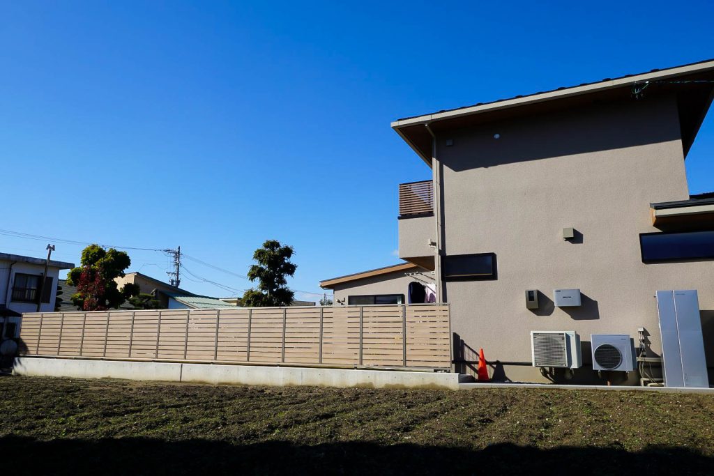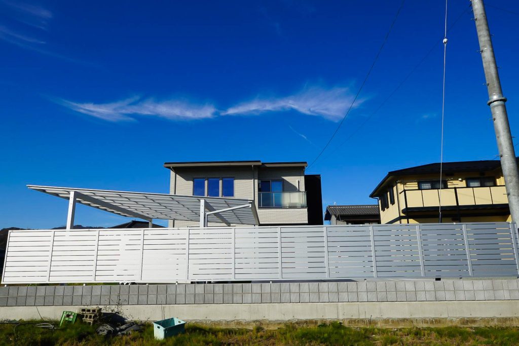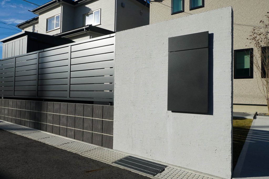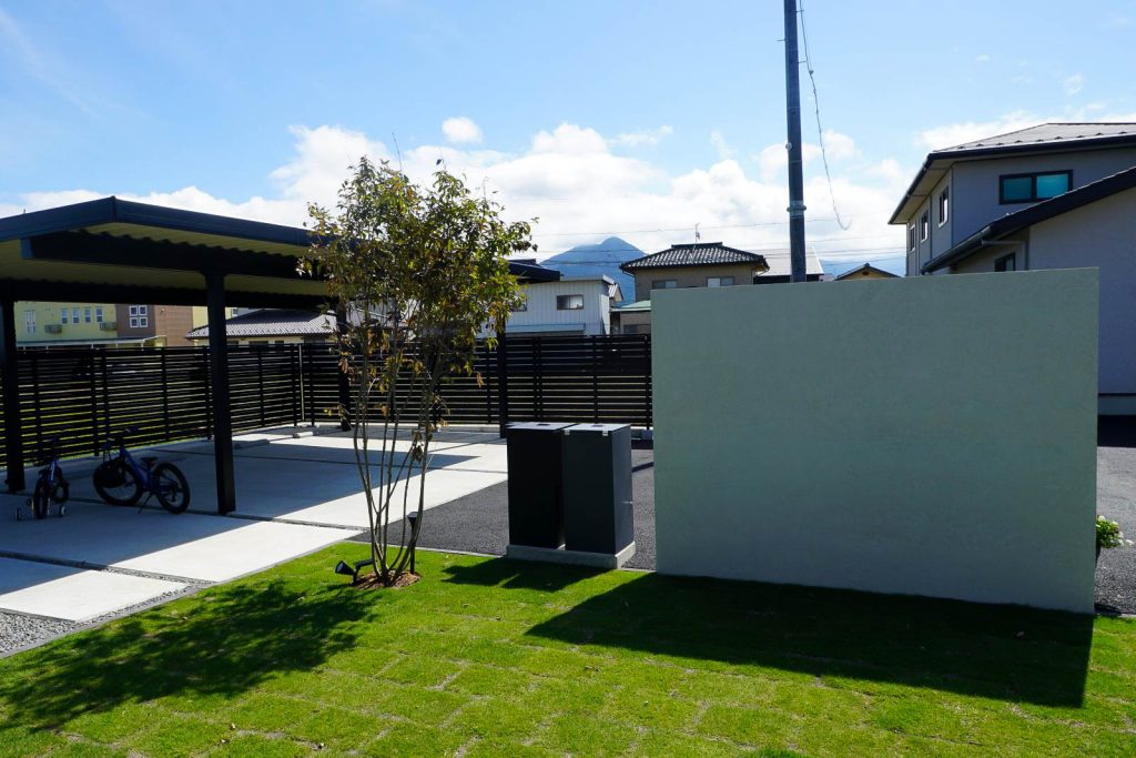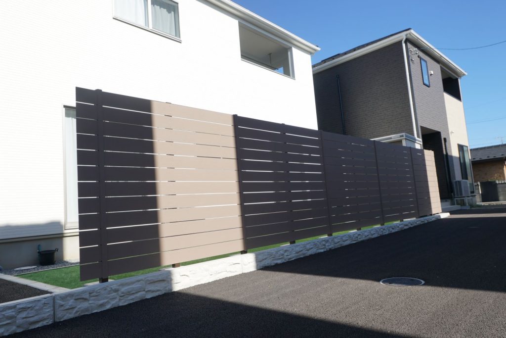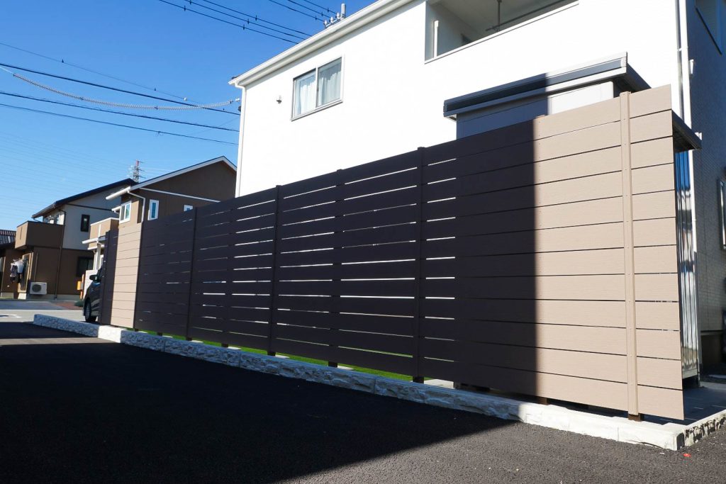 道路からの目隠しにH1400の木調アルミフェンスで敷地全体をナチュラルに印象付けました。