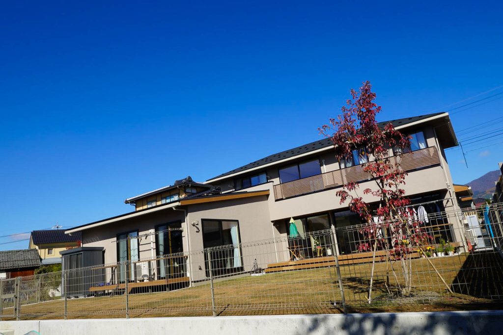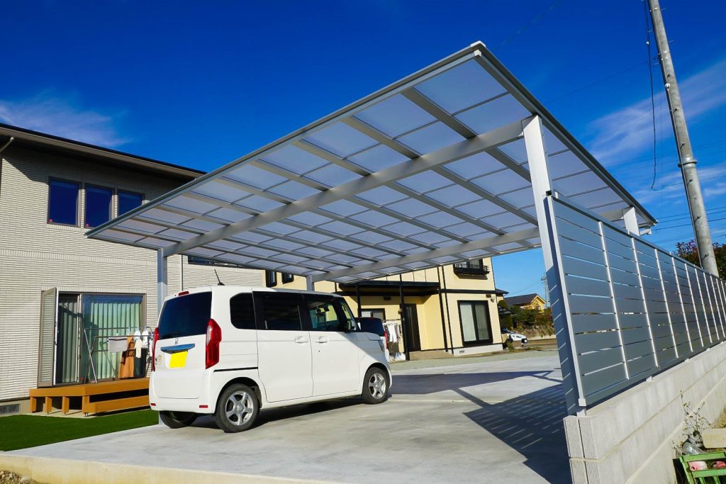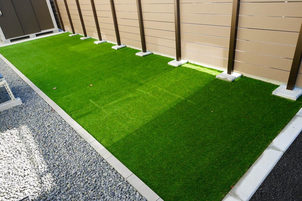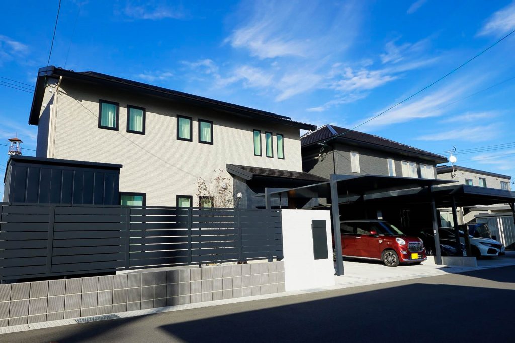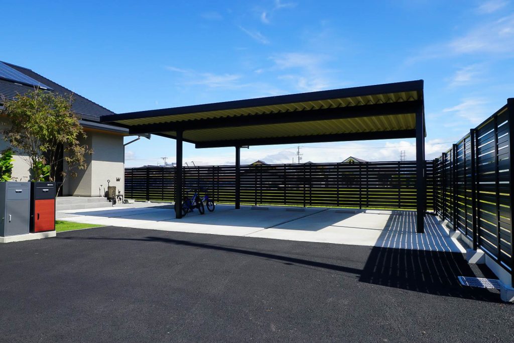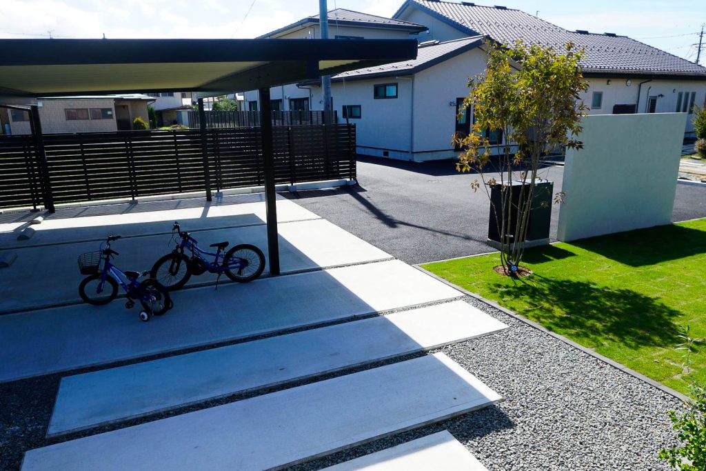 道路からの目隠しにH1400の木調アルミフェンスで敷地全体をナチュラルに印象付けました。