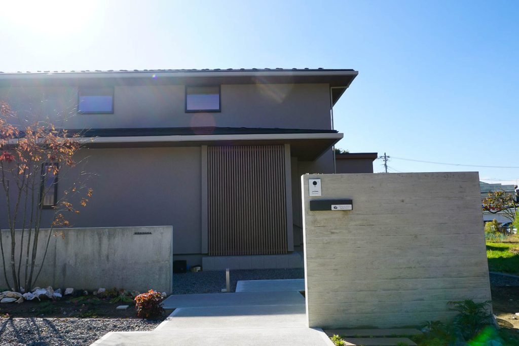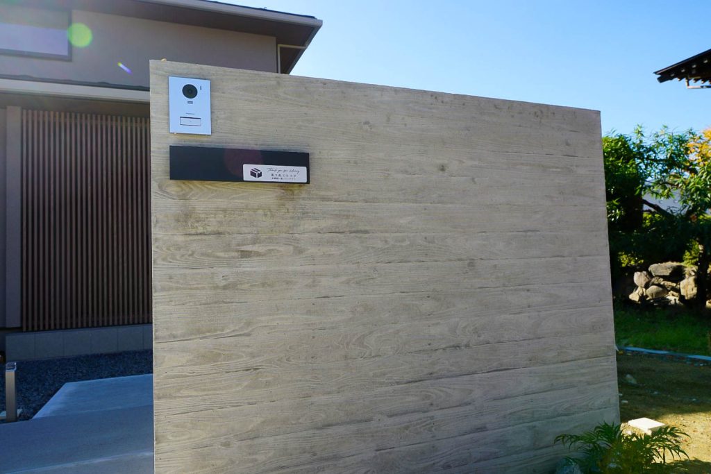 表面に杉の木目が浮き出る杉板型枠を使用した風格あるRC門塀。
