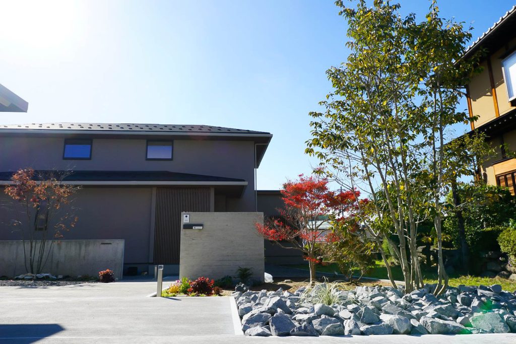 3mを超える株立のソヨゴが道行く人の視線を集め、赤く染めるドウダンツツジがアプローチに彩どりを演出します。